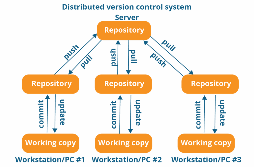 - How it works: Every developer gets a full copy (clone) of the entire repository, including history, on their local machine.